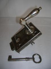 Renoverat lås med förnicklat trycke och låsvred, där en stor del av förnicklingen är bortsliten ner till mässingen. 1800-/1900-tal. För vänsterhängd dörr.