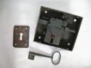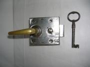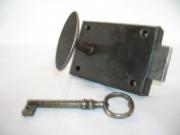 Skåpslås från 1800-/1900-tal för vänsterhängd dörr. Låset har inte en fjädrande låskolv utan vrids om med nyckel.