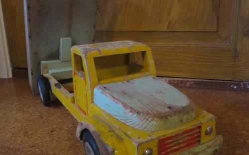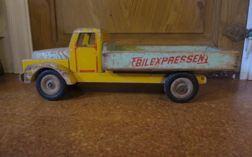 Stor leksakslastbil av trä med hjul av gummi och med texten Bilexpressen skrivet på flakets bägge långsidor. Bilen är sliten och lagad, men färgmässigt helt i original. Flaket går att fälla upp.1940-tal. Ett mycket charmigt inredningsföremål.