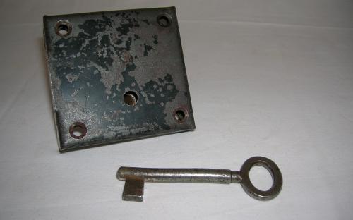 Skåpslås från 1800-/1900-tal för vänsterhängd dörr. Låset har inte en fjädrande låskolv utan vrids om med nyckel.