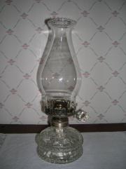 Oljehus av pressglas med brännare av förnicklad metall.Mycket vackert brännglas med "krusad" avslutning längst upp.Ovanlig modell av fotogenlampa.