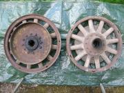 2 st. fälgar av järn med träekrar och kullager. Troligen till bil från 1920-talet eller något äldre. Bra skick förutom rosten! En skadad navkapsel medföljer.