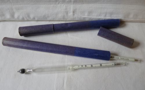 Mätare av glas med tillhörande originalfodral av papp. På mätaren står ALKOHOLMETER EFTER TRALLES. 2 st. finns. Längd: 23 cm Längd inkl. fodral: 24,5 cm Pris: 225 kr/st.Artikelnummer: 2210Övrigt