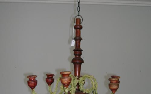 En mycket vacker, liten träljuskrona i rödbrun färg som fernissats och där de 6 ljusarmarna i tråd har klätts med kräppapper. Kronan är från tidigt 1800-tal. Höjd: 42 cm Diameter: 35 cm HÄMTVARA Pris: 4.500 krArtikelnummer: 9079AllmogeLampor & belysningLilla kvalitetsavdelningen