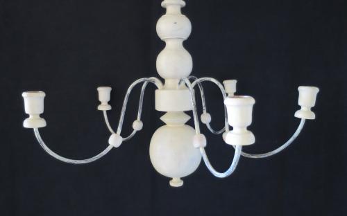 Senare målad ljuskrona med kropp och ljushållare av trä och 5 ljusarmar av tråd. Höjd: 43 cm Pris: 3.800 krArtikelnummer: 7257AllmogeLampor & belysningLilla kvalitetsavdelningen