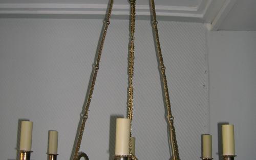 Ampel i Karl-Johan-stil för elbelysning: 6 ljusarmar och 2 glödlampor inne i ampeln. Höjd: 73 cm Diameter: 60 cm HÄMTVARA Pris: 2.000 krArtikelnummer: 9968Lampor & belysning