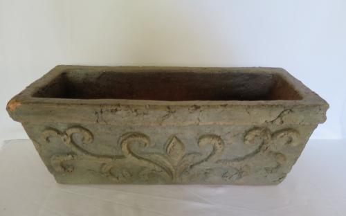 Blomlåda av bränd lera med reliefmönster som senare målats. Ett hörn med liten flaga. Inte så gammal. Längd: 38 cm Bredd: ca 15 cm Höjd: ca 14,5 cm Pris: 50 krArtikelnummer: 876TrädgårdLoppis (inget kostar mer än 100 kr)