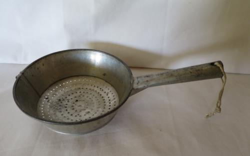 Durkslag av bleckplåt. Längd: 28 cm Diameter: 16 cm Pris: 85 krArtikelnummer: 5419-1KökLoppis (inget kostar mer än 100 kr)