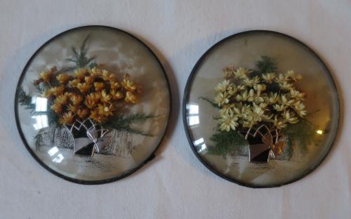 Ett par eternelltavlor inramade under kupat glas försedda med upphängningsöglor på baksidan. Troligen från slutet av 1800-talet. Diameter: 9 cm Pris: 150 kr/st.Artikelnummer: 2096Kuriosa & samlarföremålÖvrigt