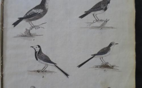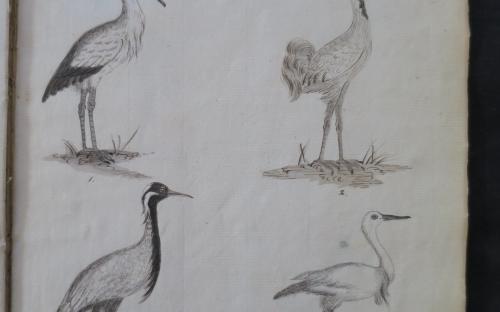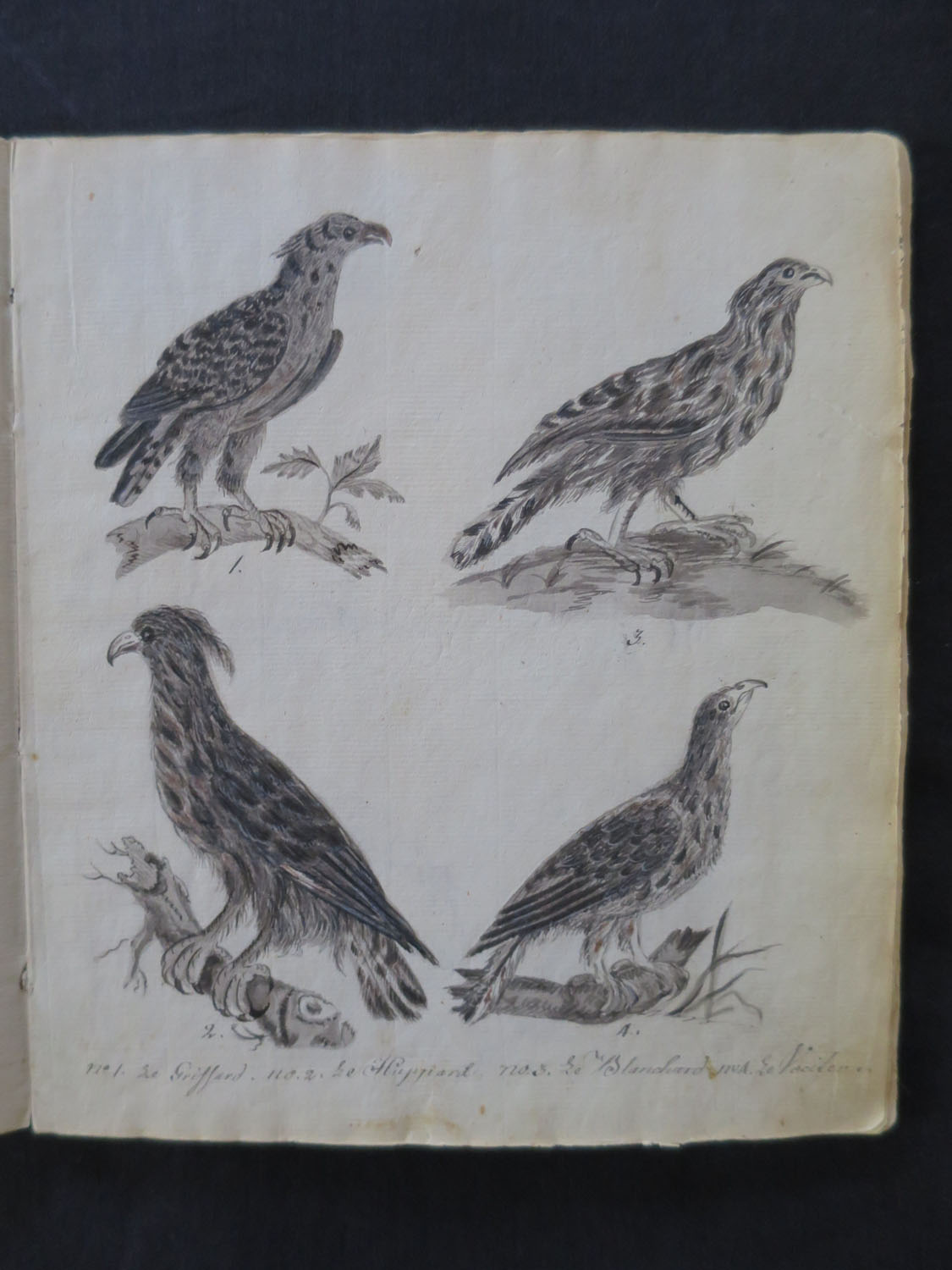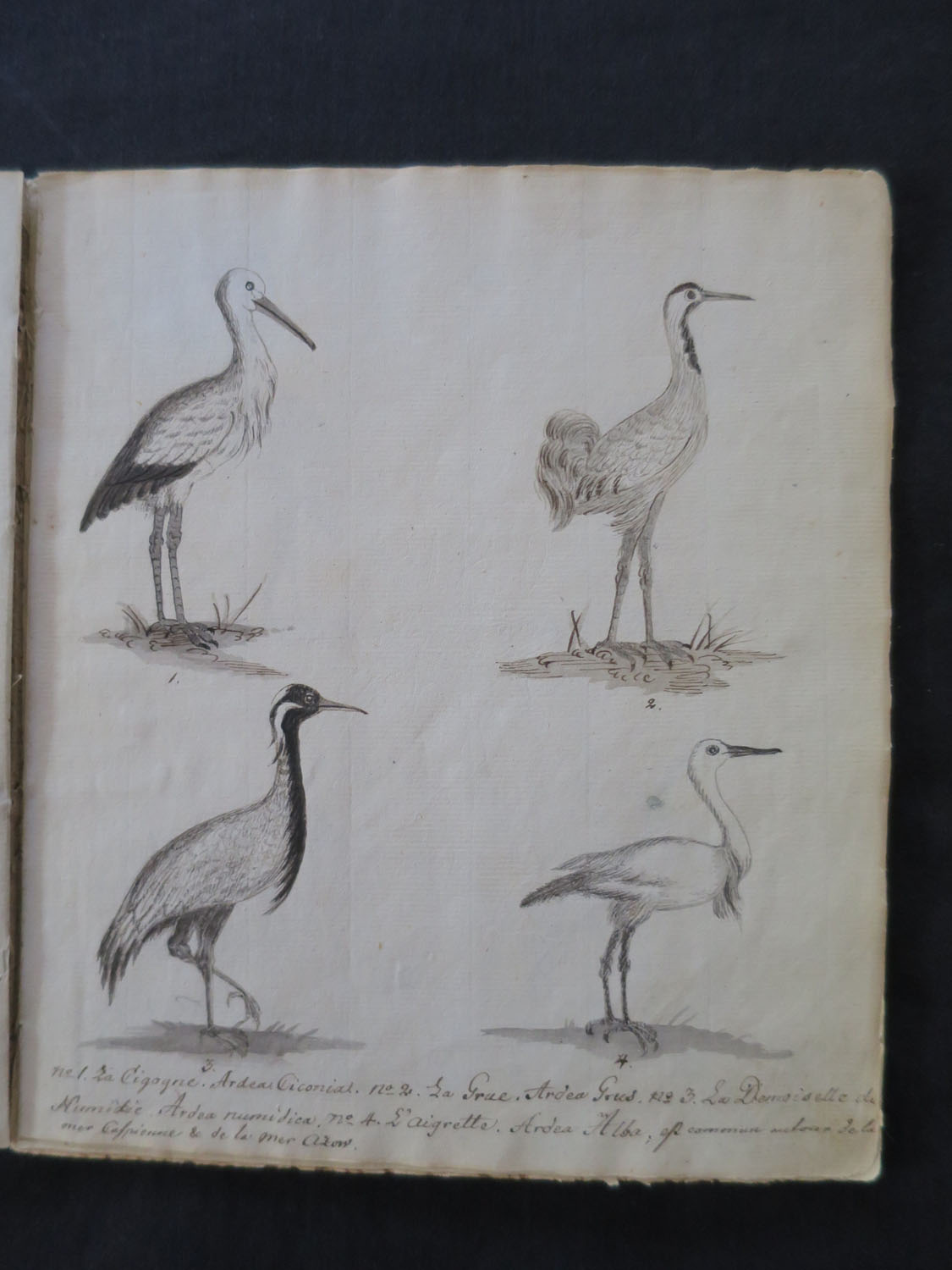 Ett privatbundet band utan årtal. Lös i bindningen, med två små revor i två av bladen. Boken har marmorerade pärmar med en påklistrad och handskriven etikett F o g l a r. Sammanlagt 15 sidor med illustrationer av 77 olika fågelarter, som är utförda i tusch som laverats och på några enstaka fåglar målats med lite vattenfärg. Många av bilderna går med stor säkerhet att härleda till Histoire Naturelle av Comte de Buffon som gavs ut 1749-1789. Illustrationerna finns bara på ena sidan, baksidan är alltid tom. Alla fåglar har en åtföljande text på franska och latin, mycket tunt och sirligt skrivet. I övrigt finns ingen text. På främre försättsblads insida (något bakre finns ej) står skrivet med blyerts: Från C.H. (möjligen K) Östberg. Med boken följer ett maskinskrivet brev daterat Bryngelsgatan 4 Falköping 5-XI-56, där boken nämns och diskuteras.