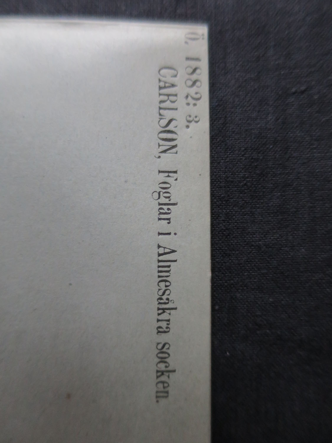 CARLSON, AUG.: Foglar i Almesåkra socken. Öfversigt af Kongl. Vetenskaps-Akademiens Förhandlingar 1882. 18 sid. Häftad med enkelt gråpappersomslag.