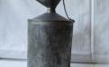 Liten fotogendunk av bleckplåt där toppen är utformad som avhällningspip som går att tillslutas med en kork fastsatt i en kedja. Ett litet rosthål finns i botten, vilket bör gå att laga. Annars i ett mycket fint skick.