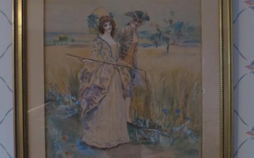 Akvarell föreställande 1700-talspar på promenad vid ett sädesfält. Signerad VH (?). Ramens mått: 33,4 x 46,4 cm Pris: 650 krArtikelnummer: 7956Konst & tryck