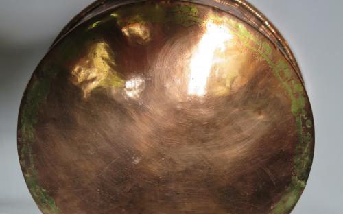 Slaglödd och klamrad kopparbunke i tjock kopparplåt med sliten förtenning. Användes bl.a. att göra ostkaka i. Diameter: ca 29 cm Höjd: 7,5 cm Pris: 220 krArtikelnummer: 878-1Kopparföremål