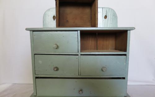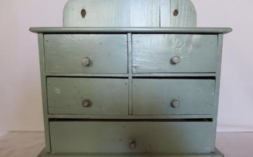 Kryddhylla för hängning på vägg med 4 små och 1 större låda. Troligen hemtillverkad i början av 1900-talet.