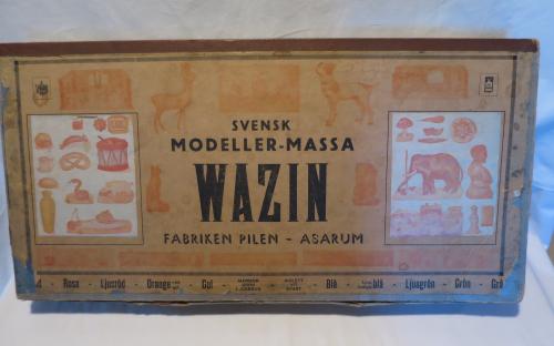 Originalkartong i hårdpapp som innehållit Modeller-massa WAZIN från Fabriken Pilen i Asarum. I kartongen finns 12 fack för lika många färgvarianter. Kartongen är sliten men ändå i ett hyfsat bra skick.