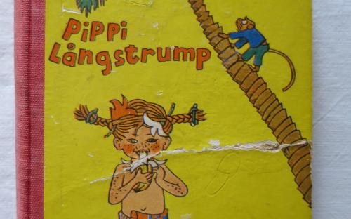 LINDGREN, ASTRID: Pippi Långstrump i Söderhavet. 1959. 167 sid. Inb. med svv. illustrationer av Ingrid Vang Nyman. Främre pärm loss och med veck, samt saknas främre försättsblad. Runda hörn och snedläst. Namnteckning.