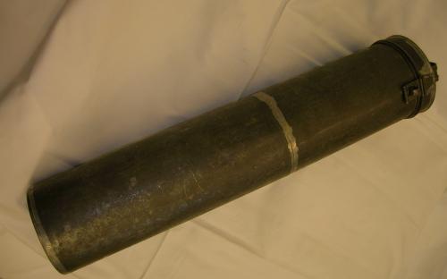 Troligtvis är detta ett fodral i bleckplåt som använts ute i fält för att förvara kartor och handlingar i, t. ex. av en lantmätare. Locket är gångjärnsförsett och går att låsa med ett hänglås. Locket har även ett bygelhandtag att bära i. Gissningsvis från 1800-talets första hälft.