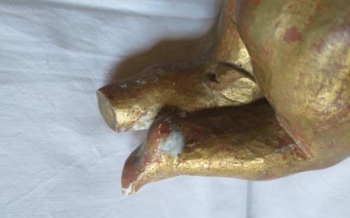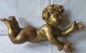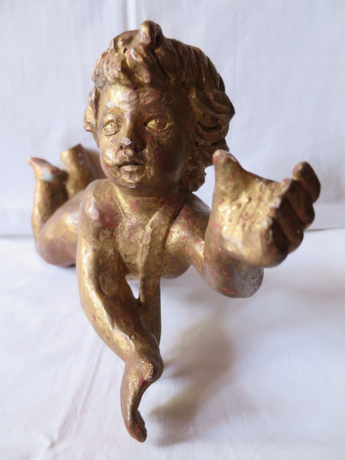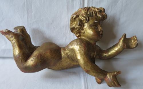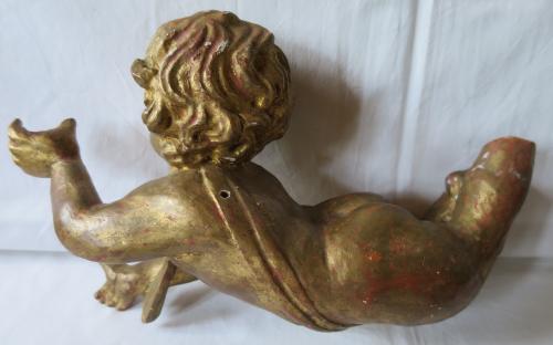 Förgylld putto av trä som med stor säkerhet tagits från en sakral miljö. Ena foten är kapad, men detta behöver inte betyda att den har sett ut så här från början utan att den kanske senare fått en annan placering och modifierats i efterhand. Vänstra skuldran har ett borrhål som kan tyda på någon form av upphängning. Armarna och händerna antyder att någonting varit placerat där Mycket dekorativ och i fint skick.
