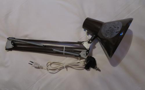 Vikbar skrivbordslampa i brunlackerad metall med plåtskärm. Tillverkad av E.S. Horn A/S Aalestrup Danmark. På skärmen finns rester av ett klistermärke, vilket förmodligen går att avlägsna. I övrigt i ett bra skick.