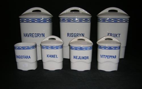 Porslin. Stämplade Rörstrand. Havregryn, felfri. Risgryn, liten nagg i botten. Frukt, två små sprickor.