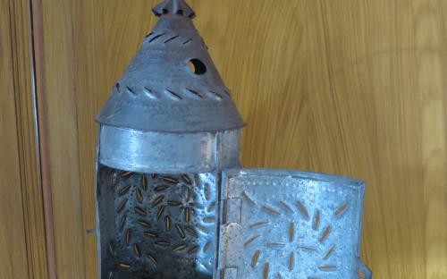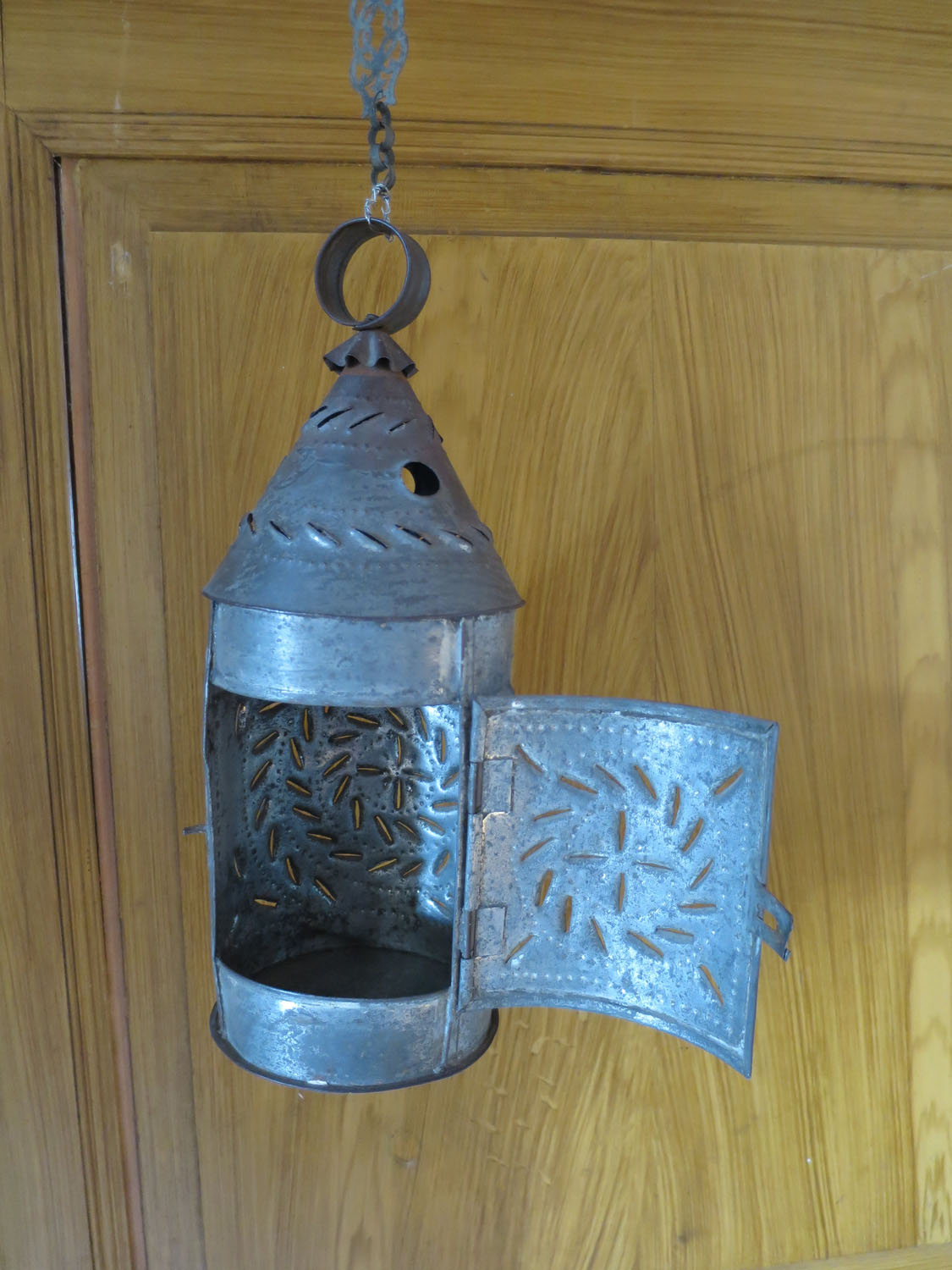 Lykta av bleckplåt med upphängningskedja också i bleckplåt. Kärt barn har många namn; förutom spiklykta kallas den även kjolvärmare, då kvinnorna kunde ställa den under kjolen när de satt i kalla kyrkor under långa predikningar för att värma sig. Även andra namn finns. Denna lykta är i ett mycket fint skick.