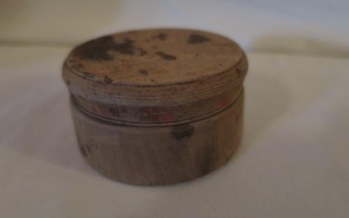 Svarvad träask där burk och lock troligtvis inte hör ihop även om de passar varandra. Trälocket är dekorerat med rosaröda punkter längs kanten. Mörka fläckar på locket. Höjd: 4 cm Diameter: 7,6 cm Pris: 30 krArtikelnummer: 659Loppis (inget kostar mer än 100 kr)
