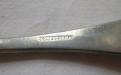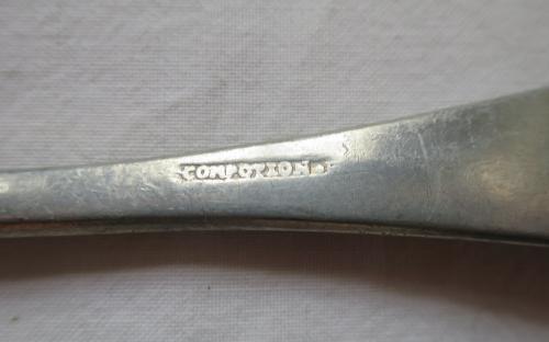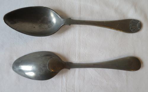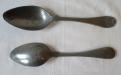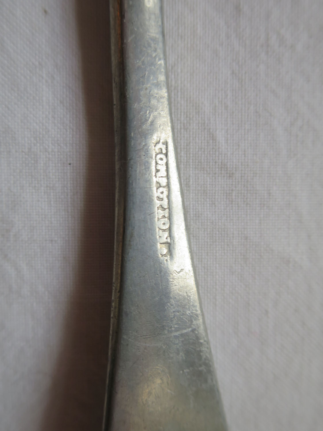 Ett par tennskedar av kraftig tillverkning stämplade COMPOTION (egentligen composition, men stämpeln är felstavad!). Troligen 1700-tal. Mycket fint skick. Se även artikelnummer 1564!