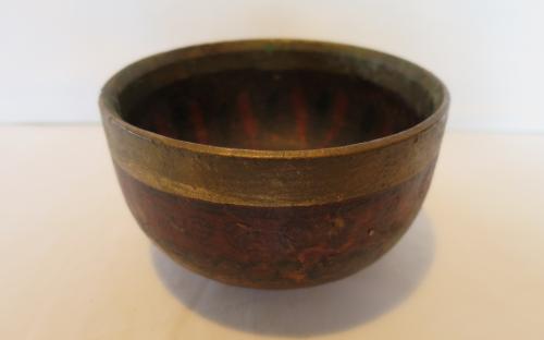 Svarvad träskål med liten klackfot. Både originalmålning och senare övermålning med bronsfärg finns. Originalmålningen finns både på utsidan och insidan men är täckt med en senare lack.