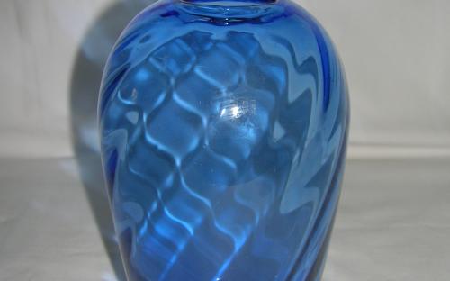 Svagt blåtonat glas med slät utsida och vriden insida. Höjd: 14,5 cm Vasmynningens diameter: 3,3 cm Pris: 120 krArtikelnummer: 458Glas