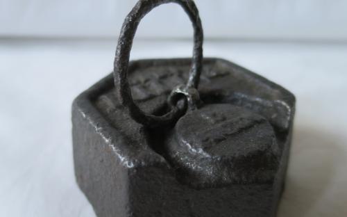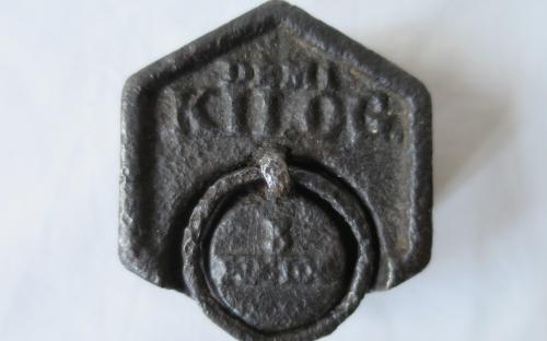 Sexkantig 1-kilosvikt av järn stämplad KILOG. samt ytterligare svårläst text p.g.a. att vikten är lätt gravrostskadad. Undertill finns tre lika svårtydda stämplar. På ovansidan finns en fastsatt ring att lyfta vikten i. Höjd: 3 cm Diameter: 6,5 cm Pris: 250 krArtikelnummer: 1813AllmogeÖvrigt