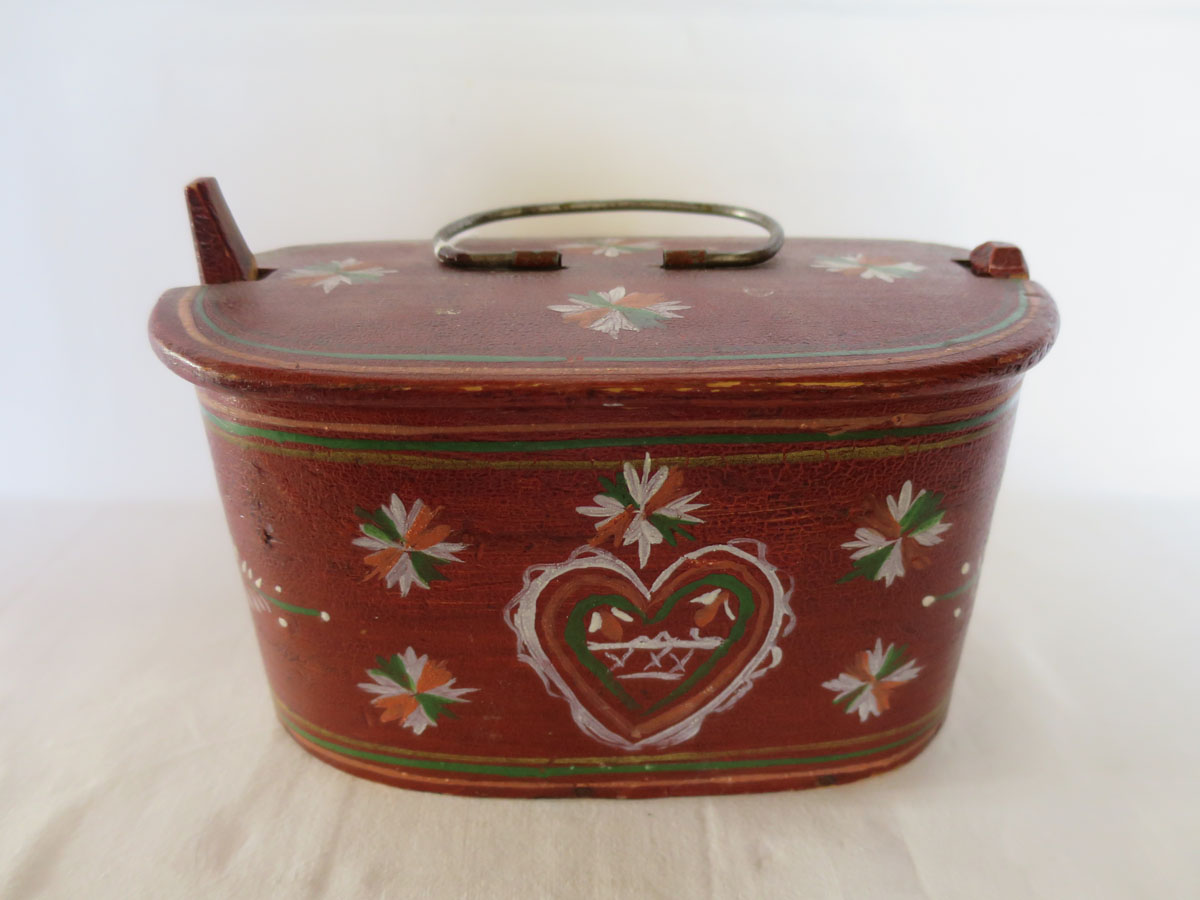 Originalmålad svepask, eller svepäska, från 1800-talets slut med handtag av järntråd. En typ av skrin som ofta såldes på marknader. Lite färgbortfall.