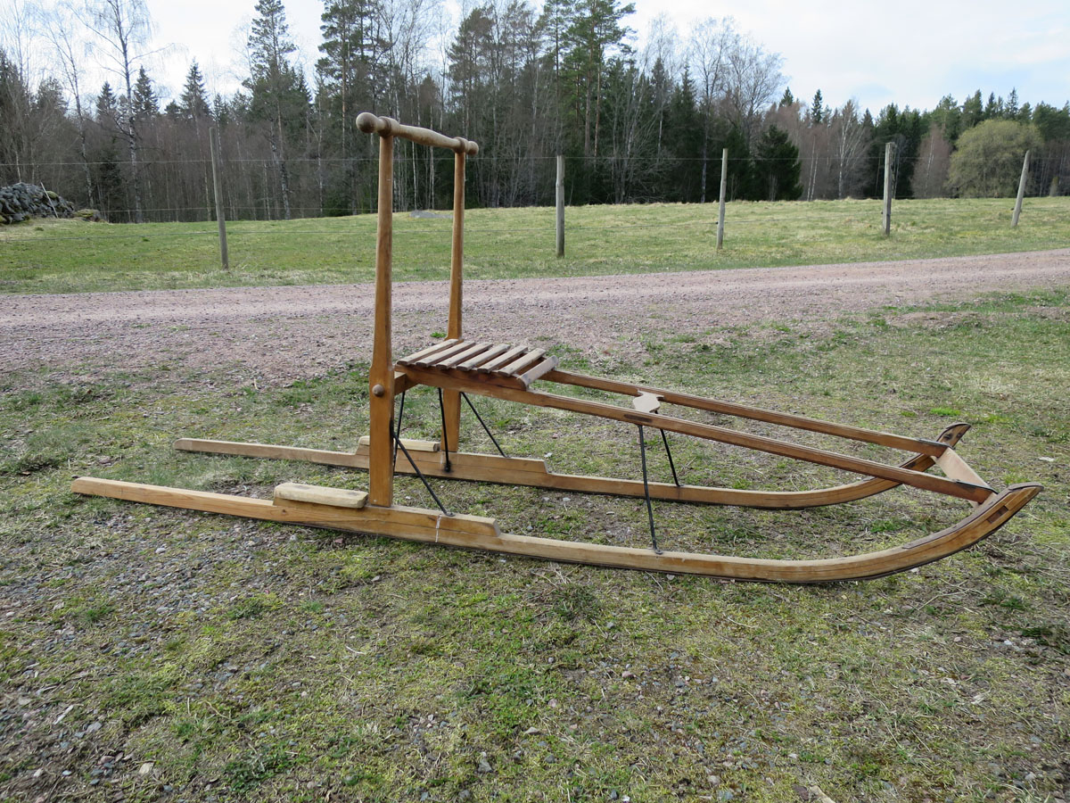 Mycket fin hemtillverkad spark, tillverkad av trä och smide, från 1800-talet. Senare lagning av ena meden. Har du en butik är den här sparken given i julskyltningen...