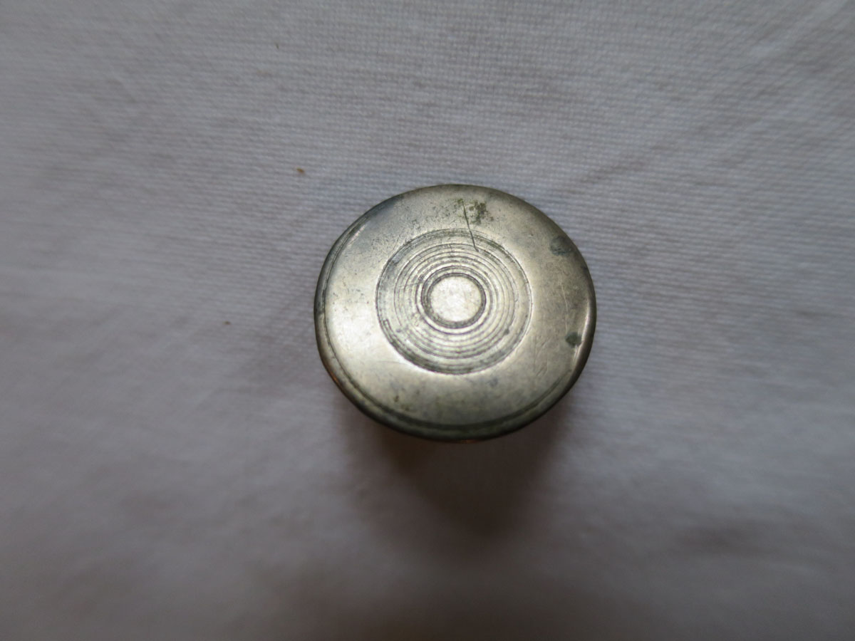 Troligen 2 st. knappar av silver, gissningsvis före 1850. Knappen med cirkeldekor väger 2 g och den med kantdekor väger 3g.