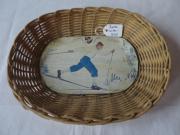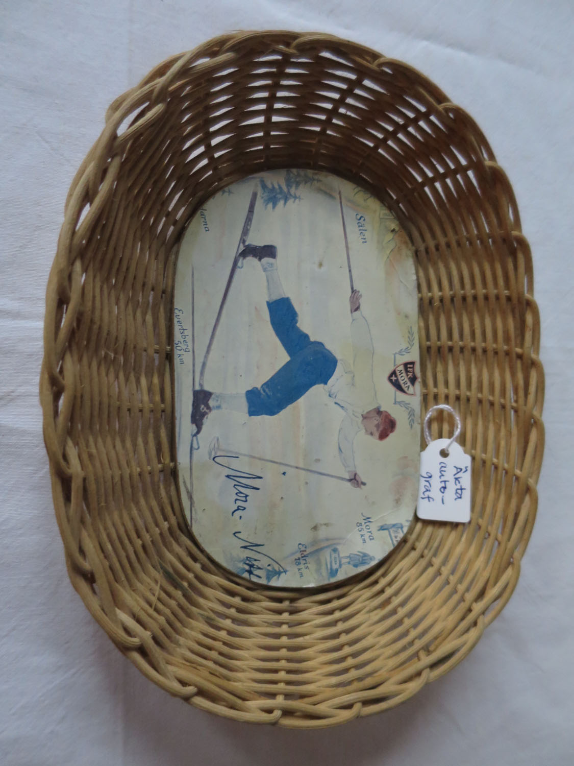 Litet brödfat där botten har en inklistrad bild av Mora-Nisse, namn på platser längs Vasaloppet och IFK Moras emblem. Detta souvenirfat har sedan blivit signerat av...
