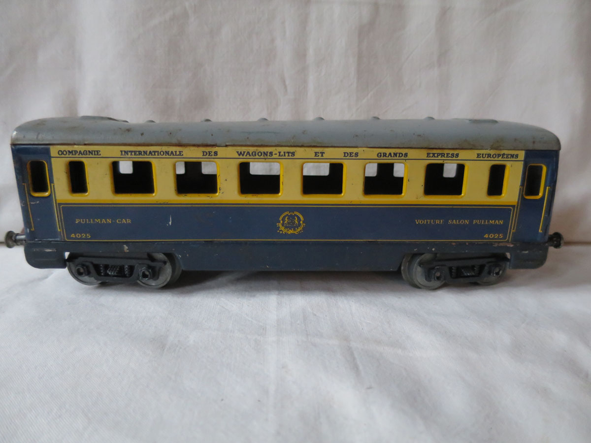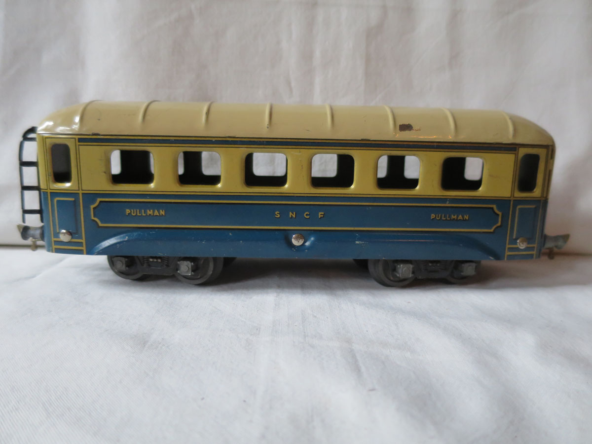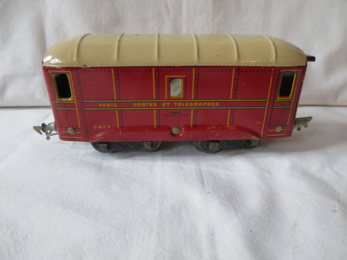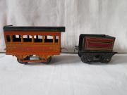 Två tågvagnar av litograferad plåt. Ingen märkning finns på vagnarna. Säljs tillsammans.