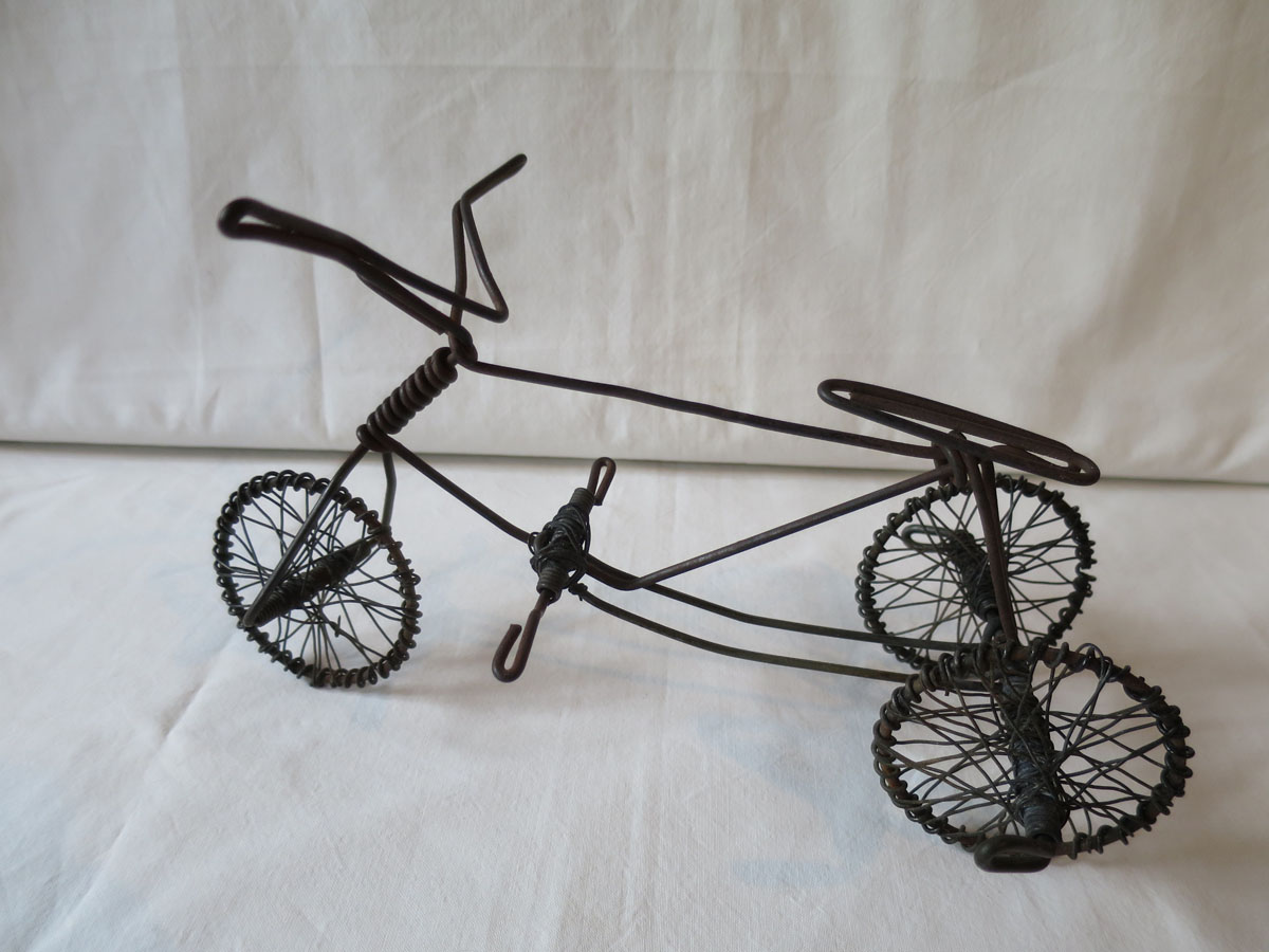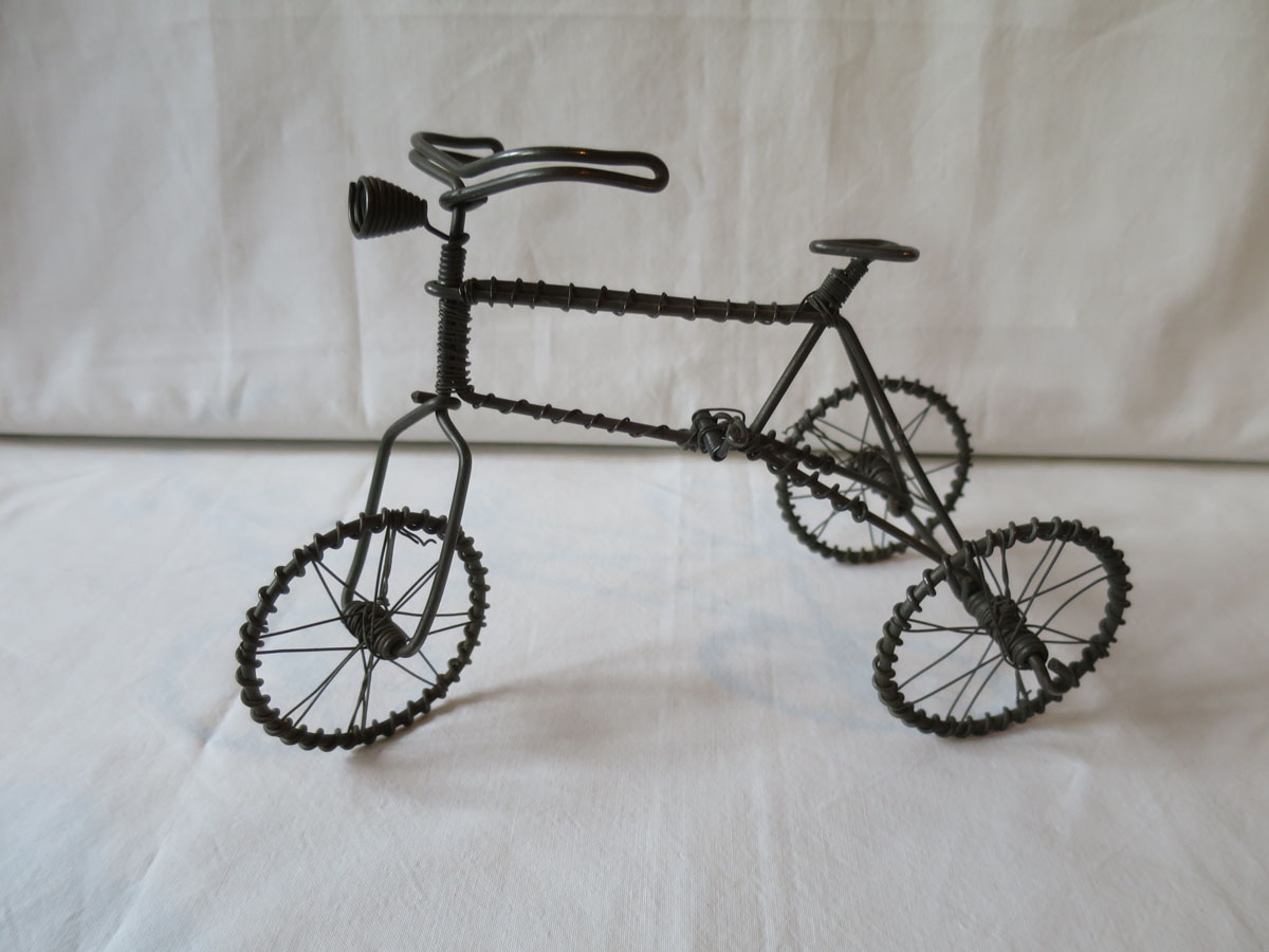 Leksakscykel av tråd, s.k. luffararbete. Mycket välgjord och fungerande.