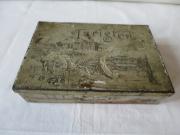 Litet plåtskrin med gångjärn. Har förmodligen innehållit någon slags konfekt och vänt sig till turister som besöker Malmö. Plåtasken har på fem sidor bilder...