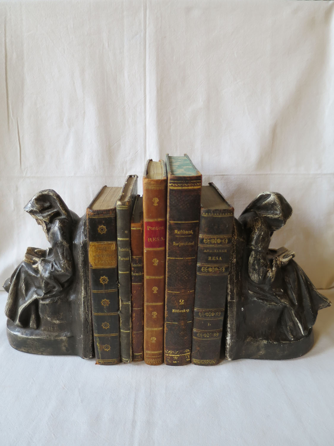 Dekorativa bokstöd av bemålad gips i slitet, men mycket fint skick. På baksidan en otydlig gjutarstämpel inom en oval och 980. Gissningsvis från 1800-talets slut...