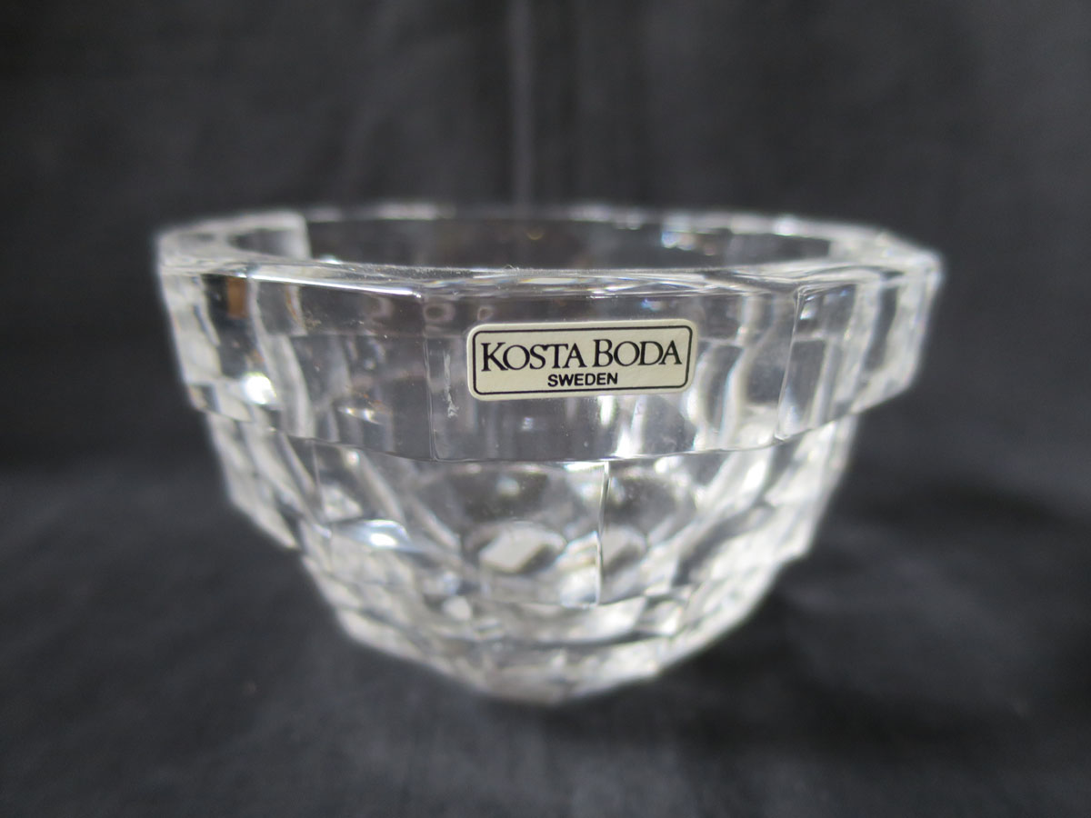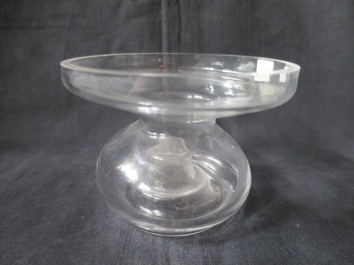 Ljusstake av glas som är vändbar så att den passar till två olika ljustjocklekar. Ljustaken är tillverkad av Kosta Boda.