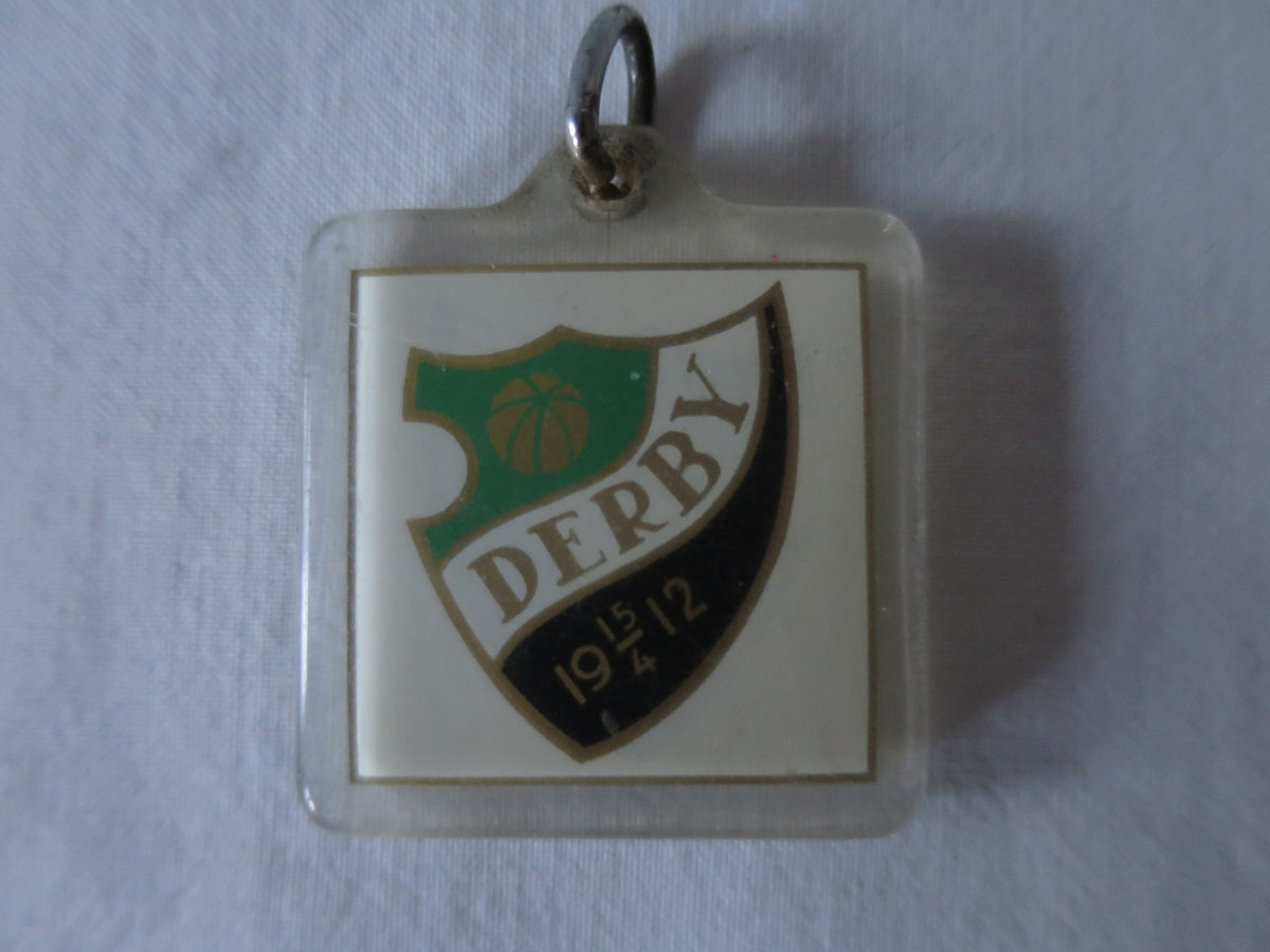 Nyckelring med klubbemblem DERBY 19 15/4 12 inneslutet i plast.