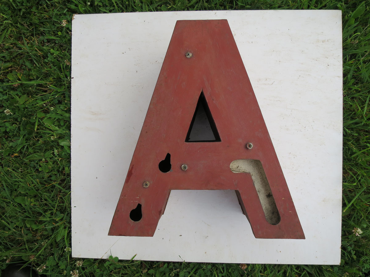 Bokstäver i plåt för neonskrift. A och M saknar dessa glasrör.