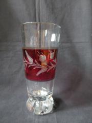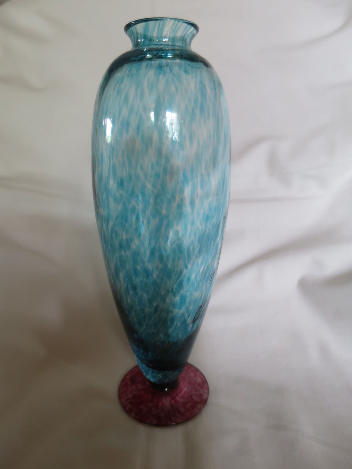Flerfärgad vas med gravyr i det röda fältet. En liten nagg på vasens mynning.