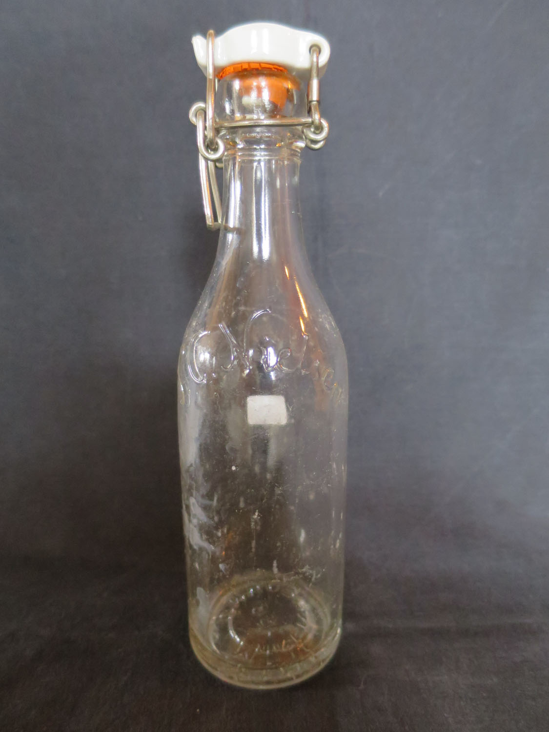 Liten dansk flaska med patentkork. Flaskan märkt på bröstet i glasmassan P.C. Nielsen Vejle. I botten är den märkt MINERALVAND 58. Porslinskorken är också märkt P.C....