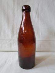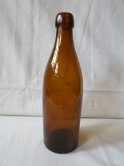 Knoppölsflaska märkt på halsen med 1/3 LIT. och W, vilket står för Westerviks Glasbruk. I botten är flaskan märkt 1900 (?).