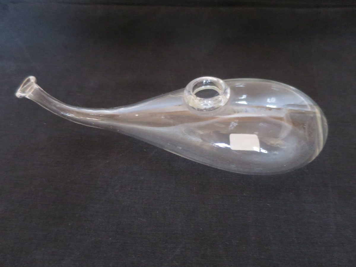 Fickplunta av klarglas. Flaskan går inte att ställa, då den har en form som en tillplattad pung. 1800-talets andra hälft.