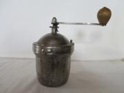 Kaffekvarn av målad plåt förutom lådan som är av trä.