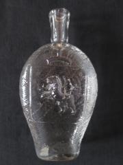 Fastblåst brännvinsflaska (lommaflaska) i klarglas med puntelmärke i botten. På ena sidan avbildas ett lejon på en vapensköld krönt med krona och på den andra sidan...