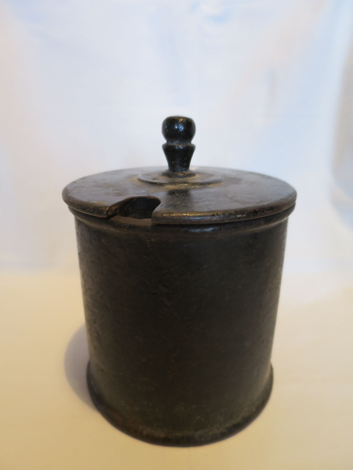 Braständare av gjutjärn. Själva tändaren som skall sticka upp ur hålet saknas. Ej helt plan i botten, vilket kan tyda på att den även använts som mortel ibland.