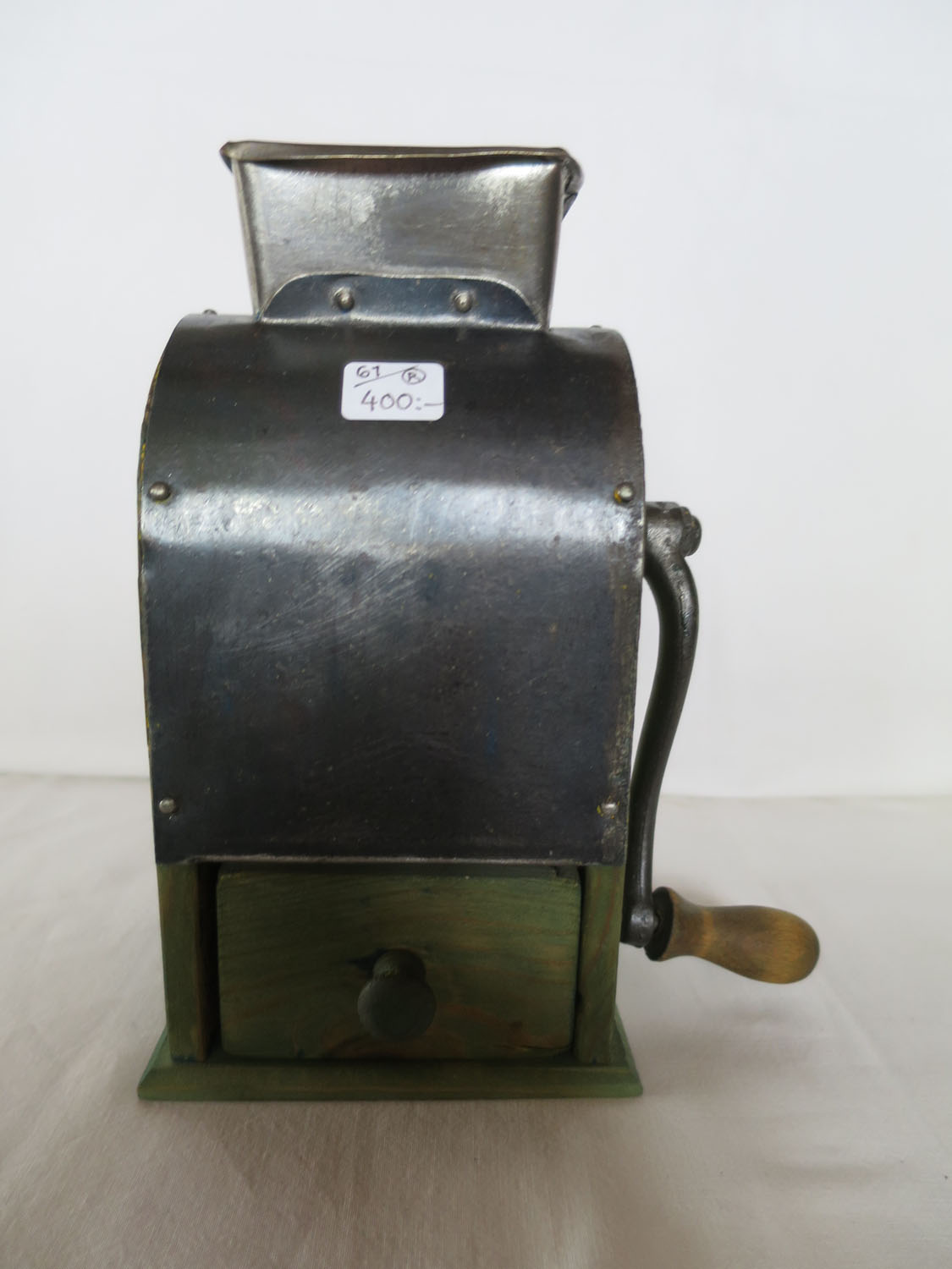 Kaffekvarn där tak, botten och utdragslådan är av trä. Sidorna är av plåt.